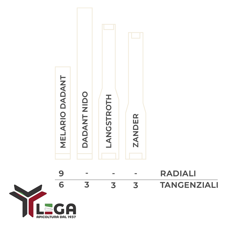 - 9 favi Melario Dadant Radiali, 6 favi Melario Dadant, 3 favi Dadant Nido, 3 favi Langstroth, 3 Zanter Tangenziali