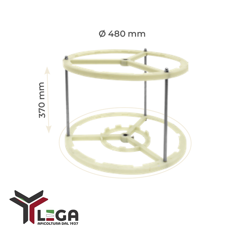 Lo Smielatore possiede una gabbia con dimensioni specifiche: 370 mm di altezza e con un diametro di base di 480 mm. Lo Smielatore è progettato per alloggiare il telaino in modo stabile durante la centrifugazione.