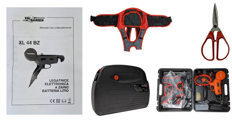 Legatrice a Batteria Valgarden XL44BZ possiede una comoda valigetta da trasporto e al suo interno si trovano il libretto d'uso e manutenzione, da consultare in qualsiasi occasione, la comoda batteria Samsung da 4, 5 AH, il caricabatteria, un cinturone da trasporto e una forbice professionale.