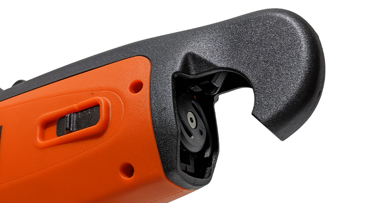 La legatrice da vigneto risulta essere molto compatta la batteria al litio è alloggiata in una apposita tasca nell'imbragatura in dotazione. Questo consente la massima maneggevolezza della legatrice professionale e libertà di movimento. Particolare del grilletto posizionato in un occhio particolarmente ampio.